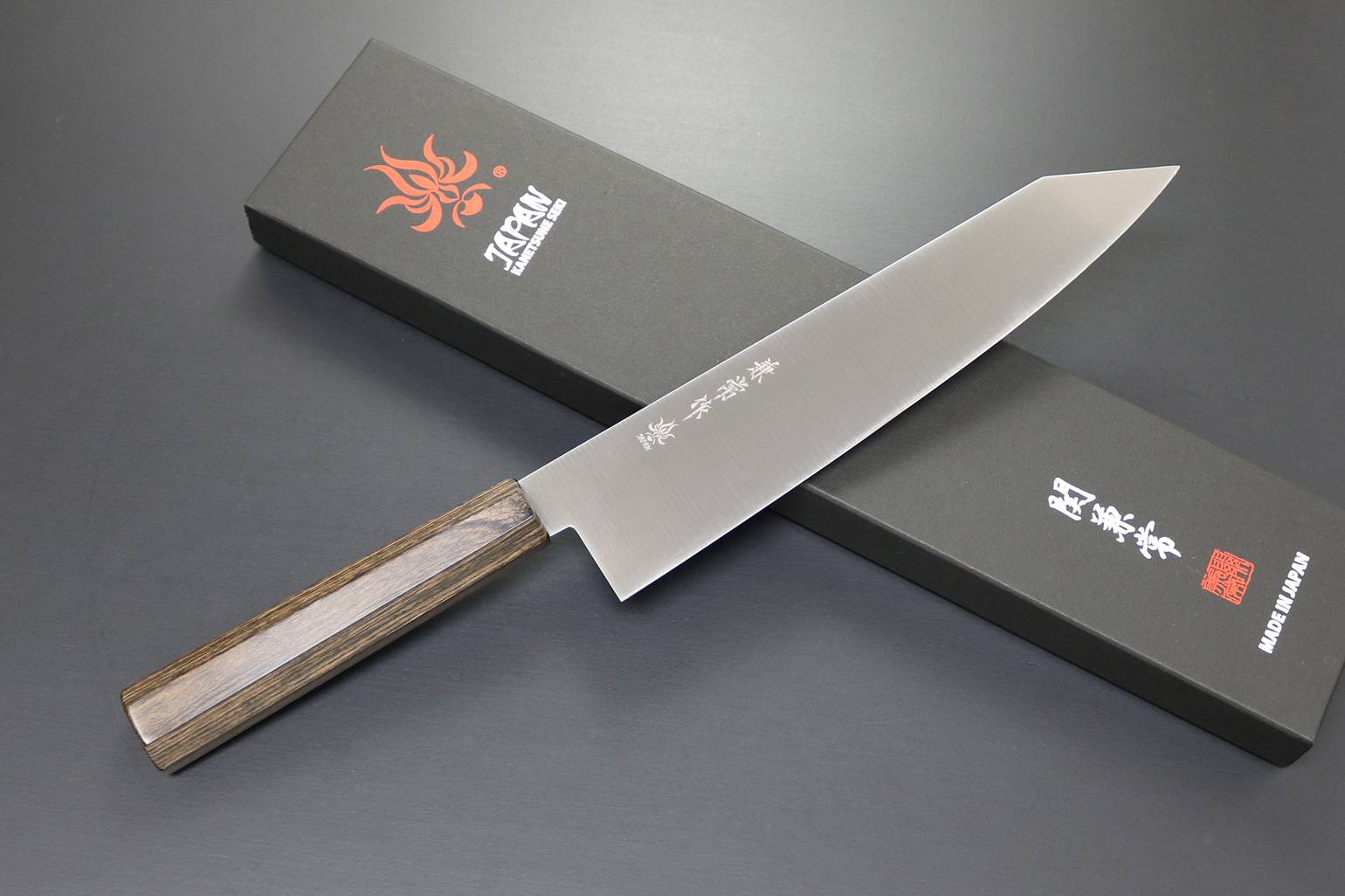 הידית המתומנת המסורתית היפנית “八角柄 HAKKAKU-E” עשויה עץ חום כהה.